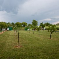 Prostorná zahrada v atraktivní lokalitě v klidu a zeleni. V blízkosti je lom s čistou vodou a super koupáním.