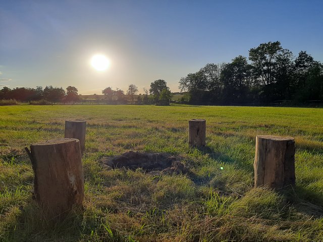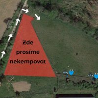 Parkovat a stanovat můžete dle libosti v části blíže k lesu. Doporučujeme místo u ohniště v rohu pozemku. Kadibudka, 2x el. zásuvka a 2x kohoutek s vodou jsou přímo na pozemku. Nejbližší obydlená budova je náš dům, asi 160m vyzdušnou čarou (od ohniště není vidět).