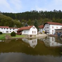 - Koupelna se sprchou s teplou vodou v objektu Čechova Mlýna na dohled od louky.