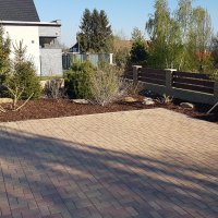 Zpevněné parkovací místo na oplocené zahradě uprostřed Českosaského Švýcarska s výhledem na skalní masiv Pravčická brána.