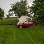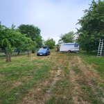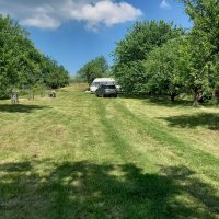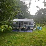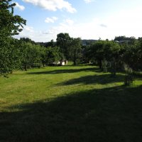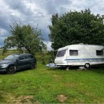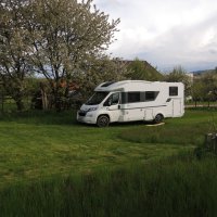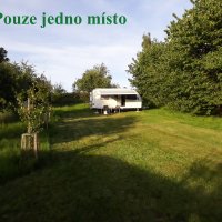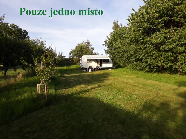 Zahrada o rozloze cca 2000m2 se nachází na okraji obce a je zde pouze jedno místo na kempování, což zaručuje vaše soukromí. Pozemek je mírně do svahu, ale máme připraveny nájezdové klíny, pokud budete potřebovat karavan vyrovnat.