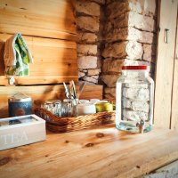 pitná voda - Skleněný zásobník na pitnou vodu s kohoutkem na Vás bude čekat v Zázemí a kanystr s pitnou vodou ještě v Chaloupce. Podle potřeby Vám vodu rádi doplníme. Užitková voda k dispozici přímo na pozemku.