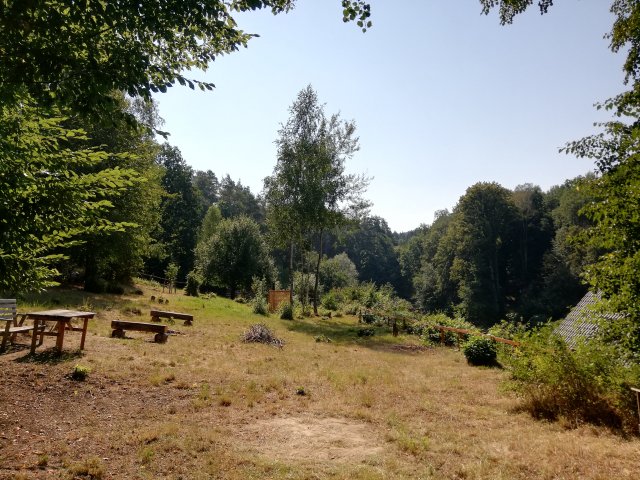Částečně oplocená louka 1000 m2 z jedné strany na pískovcové skále s výhledem na les a část vesnice. Podél louky je z jedné strany březový háj, z druhé zahrada nebo další louka. U majitelů je možné zakoupit domácí produkty z 'Drchlavské špajzky'.