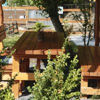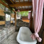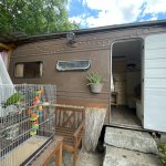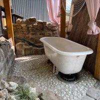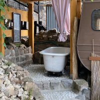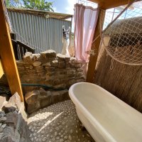 - Ihned vedle karavanu stylová venkovní solární sprcha - vana.