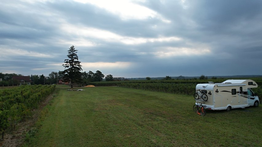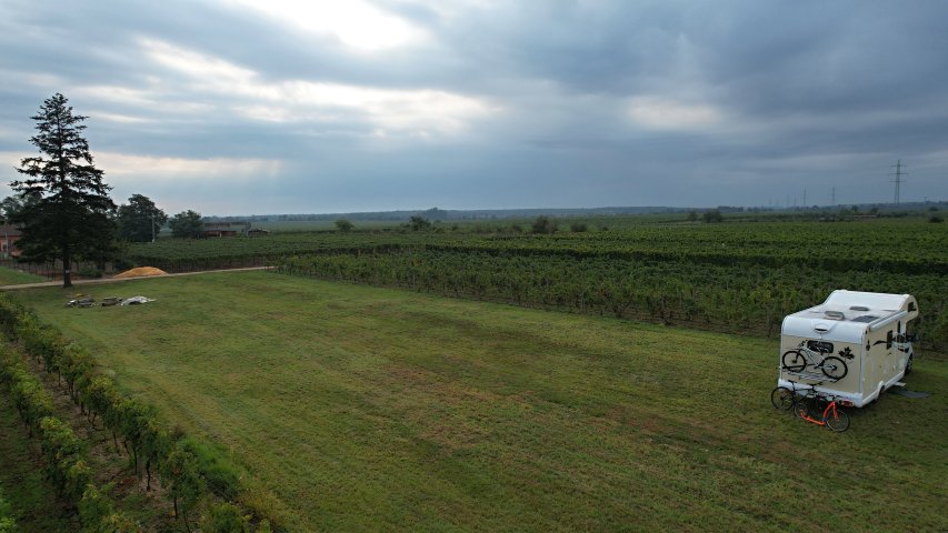 Velký pozemek, kde každý najde své místo. Nemuseli jsme ani klínovat, jde najít přirozenou rovinu. Výhodou je, že je v oblíbené vinařské lokalitě a tak dostupnost cyklovýletů za vínem je snadná. Ale i Lednický areál je za rohem. Bezproblémový příjezd. Jen si prosím povšimněte zákazu trhání hroznů na sousedních pozemcích :-).