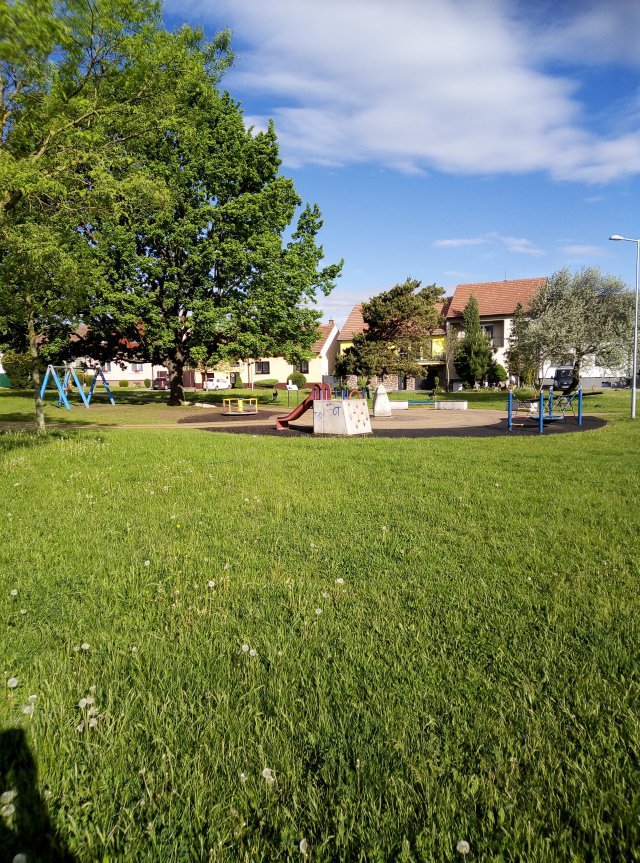 Dětské hřiště a sportovní plocha v blízkosti.