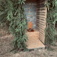 toaleta - Kadibudka na kraji pozemku u lesa vedle horizontu.