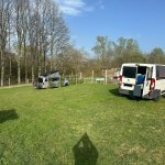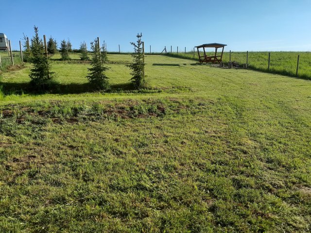 cca posledních 300 m je po prašné cestě. Ta je pro karavany sjízdná i za deště. Problém může být při vjezdu na pozemek - je v mírném svahu a na trávě - za vydatného deště může nastat problém vjet na pozemek. V takovém případě je možné zůstat u plotu na zpevněné cestě. Pozemek je oplocený lesnickým pletivem. Cesta přes vesnici vede kolem stavení - hospodářská usedlost - vypadá to, jako že jedete přes soukromý pozemek. Ale můžete pokračovat dál. Až po levé straně uvidíte karavany. Stromy kolem příjezdové cesty jsou ořezány, není problém s průjezdem. Projedete i zákazem vjezdu, který pro majitele pozemků a rekreanty neplatí.