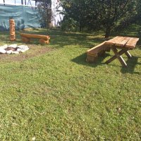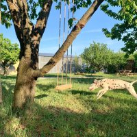 Na pozemku máme stromový domeček pro děti, houpačky, a houpací síť.....v obci je několik dětských hřišť.