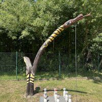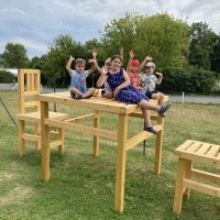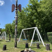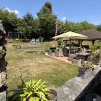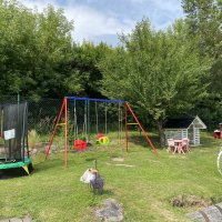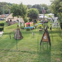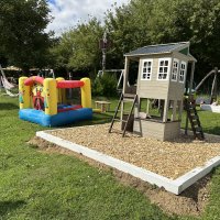 Dětské hřiště na oplocené zahrádce kavárny (houpačky, skluzavky, domečky, skákací hrad, trampolína, kuželky, ohniště) 30m od stanoviště