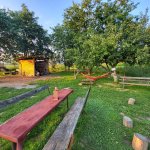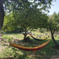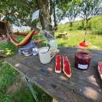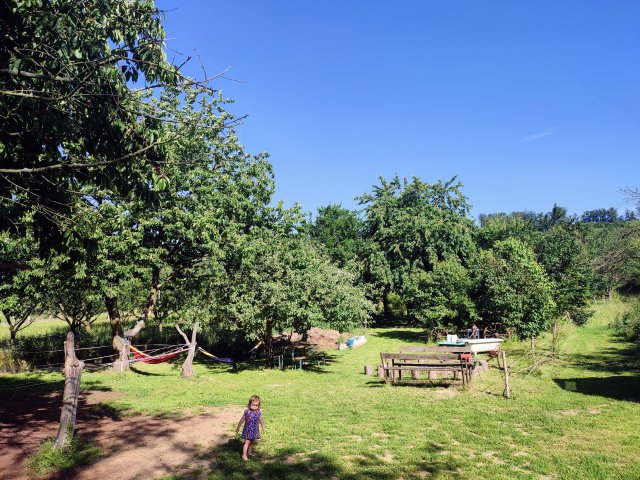 Zahrada je celá oplocená a nachází se na ní spousta ovocných stromů, které poskytují dostatek stínu i v parných dnech. Na zahradě je studna s vanou, ohniště, posezení, hamaky, pískoviště, houpačky, hračky pro děti. Můžete si zde postavit stan, ale i zaparkovat karavan, místa je tady dost (zahrada má kolem 3000 m2. Není zde elektrika ani voda, pitnou vodu máme k dispozici v barelech.