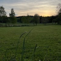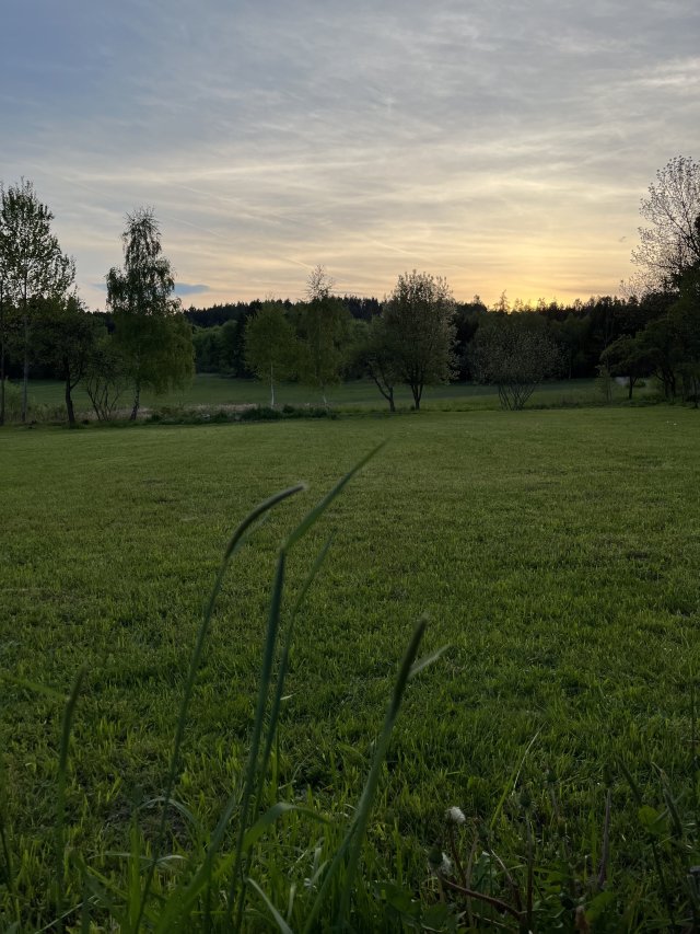 Priestranný pozemok v malej dedinke v peknom prostredí, rovný, posekaný a z 3 strán oplotený, takže s pusteným psom nebol žiadny problém (neoplotená časť oddelená jarkom a za ním lúka). Boli sme na pozemku samy, ale aj v prípade 2 hostí, by mal každý dostatok súkromia. V okolí možnosť prechádzok do lesa a blízko Hluboká nad Vltavou. Príjemní a ochotní majitelia.