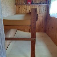 Pronájem bez lůžkovin a nádobí. Je zde samostatna valenda, a ve spacim koute dvojlůžko a nad nim palanda s molitanovymi matracemi. Spacaky a deky, pripadne jine luzkoviny vezměte vlastní. Chatka je uvnitr vybavena stolkem se židlemi, šatní skříní a komodou. Myci prostredky na nadobi jsou součástí vybaveni, samotne nadobi ale nikoliv.