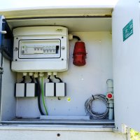 elektřina - Standardní zásuvky 4 x 230V jištěné 6A jističi se nachází uvnitř přípojkové skříně. Přístup k nim je po obdržení číselného kódu zámku. Pro připojení po celém pozemku postačuje kabel dlouhý 25 m.