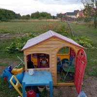 Na zahradě, je dětský domeček, pískoviště a spousty hraček.