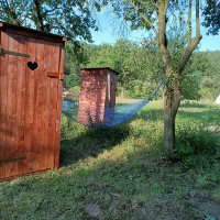 - V předzahrádce je provizorní umývárka - koryto, kde teče pitná voda. Voda vedená hadicí ze studny.