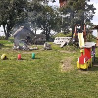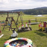 Dětské hřiště (pískoviště, houpačky, skluzavka). Kuchyňka. Balancovací kameny. Stezky. Trampolína.