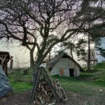 Větrné harfy. Eneolitická polozemnice (archeologický experiment). Hliněná pec na pečení pizzy či chleba.