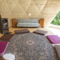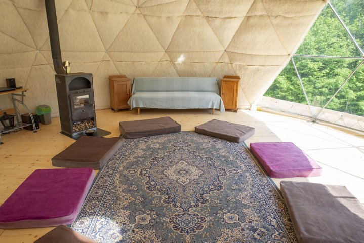 Obytná plocha kupoly je 40m2. V kupole je rozťahovací gauč a matrace, ktoré sa môžu využiť na spanie pre cca 5 osôb, pre deti máme 5 podložiek. Celková kapacita je cca 10 dospelých osôb. Nutnosť vlastných spacákov.