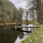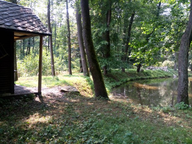 Parkování na prostorném místě u silnice před bránou, poté asi 100m pěšky k chatce kolem rybníka.