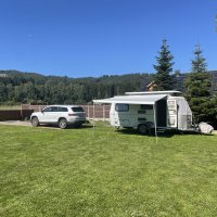 - Elektrická přípojka je hned vedle stanoviště pro karavan / obytný automobil - nalevo při pohledu od vjezdu. Od brány je vzdálená zhruba 14 metrů. Elektřinou, prosím, nevytápějte své mobilní příbytky, ani nenabíjejte své elektro automobily, či motocykly. Elektřina je určená k běžnému užití - ohřevu teplé užitkové vody v karavanech a obytných automobilech, udržování jejich trakční baterie a běžné spotřebě při pobytu na jejich palubách: svícení, rozfuk a podobně. Místo je orientačně vyznačeno na plánku pozemku ve fotogalerii.