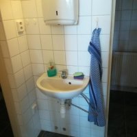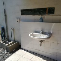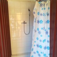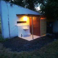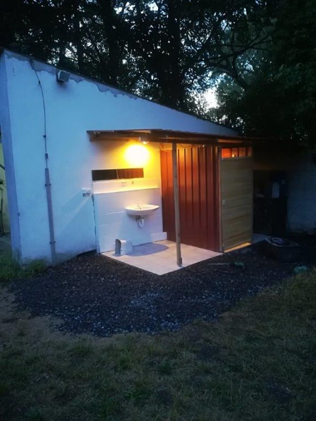- Sprcha je v přístřešku na zahradě, s teplou vodou. Venkovní umyvadlo se studenou vodou, umyvadlo v budově i s teplou vodou.