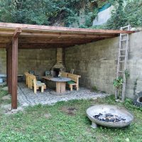 Ohniště je na pozemku, dřevo na oheň také. Na pozemku nelze vypouštět chemické WC.