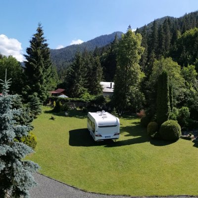 Maringotka stojící na oploceném pozemku se nachází u Lipenského jezera...