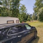 Výjezd z pozemku - tráva byla mokrá- máme karavan do 1300kg , auto 4X4 ,100kW - bez problému. Pro obytná auta za mokra bude tráva prokluzovat. Přívěsy- nějaký výkon auto musí mít- je potřeba překonat asi 200m dlouhé - větší stoupání.