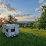 Pěkná větší zahrada (otočí se tam i auto s karavanem), vjezd na pozemek s karavanem trochu horší, hodí se pár zkušeností.