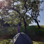 Pěkná velká zahrada s ohništěm a stromy, pod kterými šel ukrýt stan i auto před sluncem i bouřkou. Přesně to, co jsme chtěli.