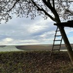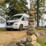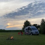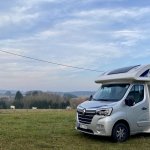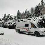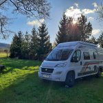 Naše první cesta úplně novým bydlíkem. Vybrali jsme si bezkemp ne úplně daleko od domova, jenom abychom auto vyzkoušeli a protože jsme se hrozně těšili. Pozemek byl vzorně uhrabaný, takže jsme na něj bez problémů zajeli i potmě, a jelikož byla půda zmrzlá, tak byl v pohodě i odjezd. Druhý den dopoledne jsme strávili chvíli bobováním na nedalekém kopečku, ze kterého byl nádherný výhled na České středohoří s Hazmburkem na obzoru.