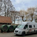 Po dohodě s majitelem jsme se postavili dolů na zpevněnou část pozemku mezi vinným sklepem a stodolou. Dostupnost v zimě a vlhku je skutečně díky tomu bezproblémová. Je odtamtud nádherný výhled na vinici a přilehlé louky. Dohoda o pozdějším příjezdu byla bezproblémová, pan majitel se s námi přijel přivítat ráno a rovnou nás nechal prohlédnout sklep, čehož jsme využili k nákupu pár láhví místního vína. Moc děkujeme za ochotu a těšíme se někdy v létě :)