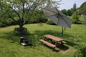 Zahrada nás přivítala vzorně střiženou trávou, nachystaným suchým dřevem a informačním letákem. Už jen za skutečnost, že /milý a velmi ochotný / majitel se tak vzorně stará o pozemek a nabízí jej jako exklusivní reservaci pro jednu posádku a to za cenu lidovou zaslouží klobouček a 5 srdíček.