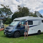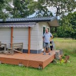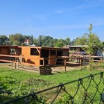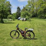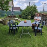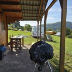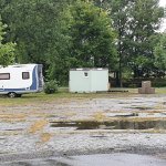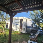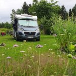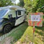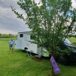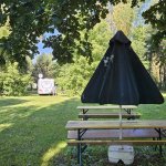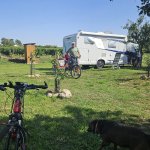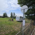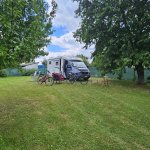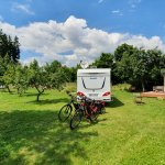 Zahrada k parkování je asi 25x30 m tak akorát pro jednu posádku.Obávali jsme se vjezdu po deštích, ale zbytečně. Zajeli jsme obytkou bez problémů. Parcela je mírně svažitá ale k rozumnému vyrovnání stačily běžné klíny. Na pozemku je několik dobrých vychytávek- zahradní sprcha na hadici a hygienická boudička, které nám plně postačovala.