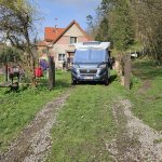 Vjezd na pozemek trochu komplikují ostré nájezdové úhly a terénní zlomy, ale pro obytné dodávky za běžného počasí určitě bez problémů, u větších obytek a souprav bych doporučil přítomnost pana majitele a obhlídku, který ze dvou možných vjezdů vyberete.