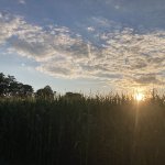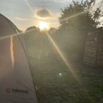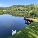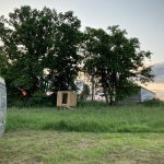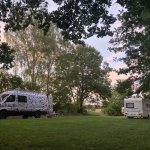 Tenhle pozemek má dvě místa. Jedno je hned na břehu rybníka (to je bez elektřiny), druhé je o kus dál (ale zase blíž k záchodům, které jsou zděné, splachovací) a vedle včel. U rybníka to bylo příjemné, je to polosamota, nikde nikdo, západ slunce přímo přes rybník, voda příjemná.