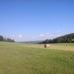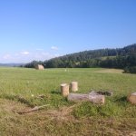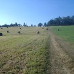 Louka splnila očekávání. Příjemně posekaná, na přelomu prázdnin s "dekorací" balíků (válců) sena. U ohniště pár dřev z lesa.