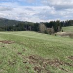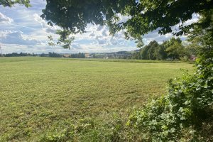 Javorná na Šumavě - Louka a nezatravněná plocha pod lesem za vesnicí.