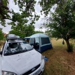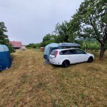 Krásná rovná tichá louka s elektřinou. Doporučujeme příjezd jen z pravé strany, vizte naši fotku s mapou zde. Příjezd z levé strany je hodně příkrý s ostrými kameny. Potěší hospoda 200 m daleko.