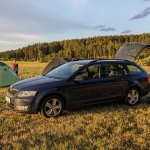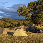 Pozemek moc pekně připravený, tráva posekaná a dostatek prostoru na přespání včetně příjemného posezení u ohně. Ani blízkost vlaku nám nevadila, protože v noci žádné nejezdily. Hezké výhledy na blízké zalesněné kopce. Snad jen by někomu mohlo vadit šumění nedaleké silnice.