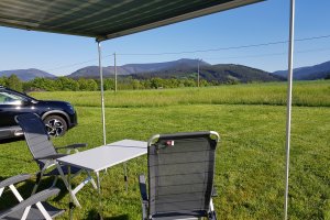 Naprostá spokojenost, pan majitel byl milý, vstřícný a ochotný nám s čímkoliv vyhovět, travnatý pozemek byl přístupný i přesto, že pršelo několik dní . Velmi klidná část s výhledem na zelené kopce Jeseníků...:-)