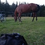 Kouzelné místo - pastvina, na které kůň spokojeně chroupal trávu kolem stanu a zvědavě nás sledoval. Vstřícný a ochotný majitel pozemku - pomohl nám s dopravou na pozemek, když jsem po úrazu nemohla trasu na kole dojet.