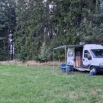 Velká louka v mírném svahu. Pokud chcete stát na hezkých místech pod lesem, klíny nutné :-) Jinak naprostá spokojenost.