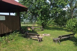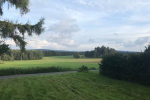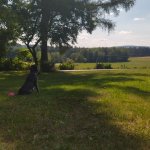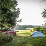 Udržovaný pozemek přiléhající k zahradě majitelů, nacházející se na konci cesty. Výhled na pole a les, na pozemku se dá schovat do stínu stromů. Příjemní majitelé, jen jsme se první ráno jsme probouzeli za zvuku nastartovaného traktoru od souseda, druhé ráno za zvuku cirkulárky, večer jsme měli štěstí na blízký koncert a noční ohňostroj. Asi takové klasické léto na vesnici. 🙂