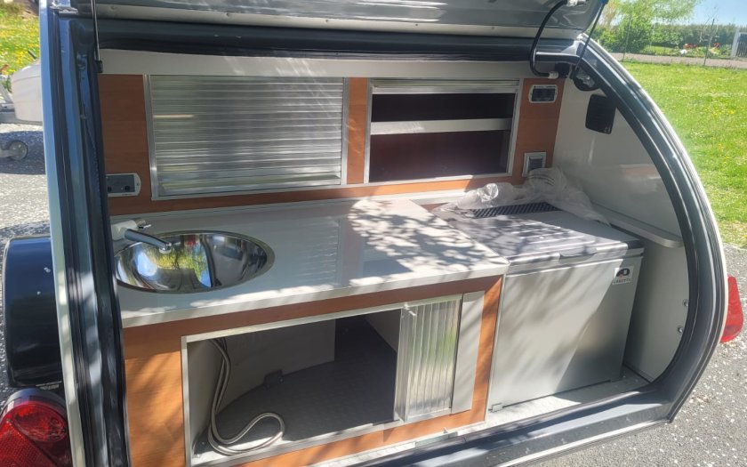 Venkovní plně vybavená kuchyňka s nádobím Vám umožní kdykoliv připravit jídlo. Obsahuje nádrž na pitnou vodu 45 l, dřez s baterií, plynový vařič a lednici s objemem 35 l. Přívěs má brzdový systém, baterii pro nezávislý provoz, střešní okno. Roletky a moskytiéry ve všech oknech. Vnitřní i venkovní LED osvětlení. V ceně jsou 2 křesla, stolek a venkovní přístřešek.