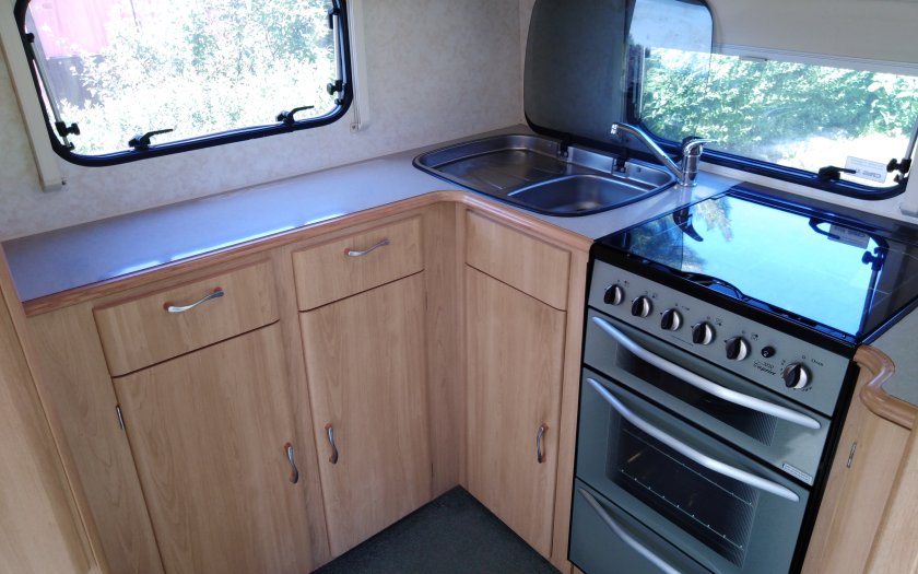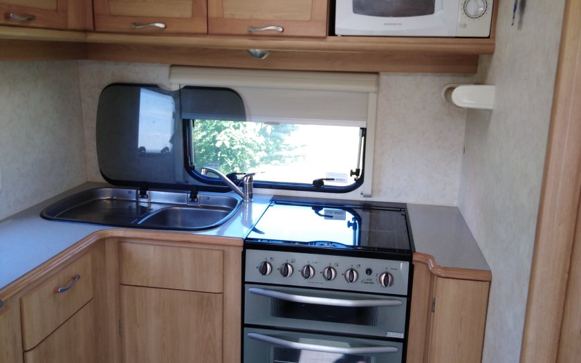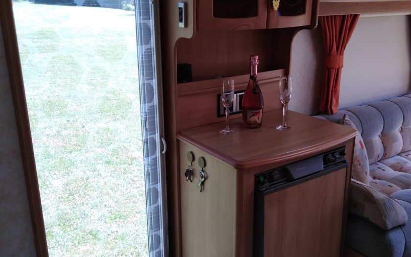 Další výbava: Topení, ohřev vody a lednička s mrazáčkem na plyn i elektriku 220 V, 12 V. Sporák, trouba, gril vše na plyn. Vybavení kuchyně: mikrovlnná trouba, rychlovarná konvice a veškeré základní nádobí. Samostatná koupelna je vybavena chem. WC s vlastním zásobníkem a umyvadlem. Sítě proti hmyzu a termorolety jsou ve všech oknech včetně dveří. Dvojitá panoramatická okna, televizní anténa na střeše. Součástí karavanu je i předstan s podlahou (možnost přespání více osob) a campingový stolek se 4 židlemi. Karavan je vybaven el. pohonem na dálkové ovládání pro lepší manipulaci např. při parkování.