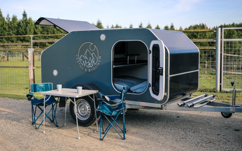 Mini karavan pro 2 dospělé osoby a dítě do 125 cm (palanda). Karavan je vybaven dvojlůžkem o šířce 140 cm a dětskou palandou, úložnými prostory a ledkovým osvětlením. V zadní části mini karavanu najdete kuchyňku vybavenou 15 l kompresorovou lednicí, jednoplotýnkovým vařičem Campingaz, dřezem s tekoucí vodou (nádrž o objemu 30 l) a základním nádobím. Uvnitř i v kuchyňce najdete zásůvky na dobíjení Vašich elektronických zařízení. Karavan je vybaven i solárním panelem s baterií, který zajišťuje soběstačný provoz. Karavan je vybaven i nosičem na 2 kola, který je umístěn na oji. Součástí výbavy je